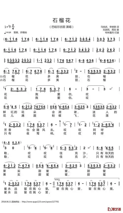 石榴花简谱(歌词)-巴哈尔古丽演唱-谱友布林夏丹上传1