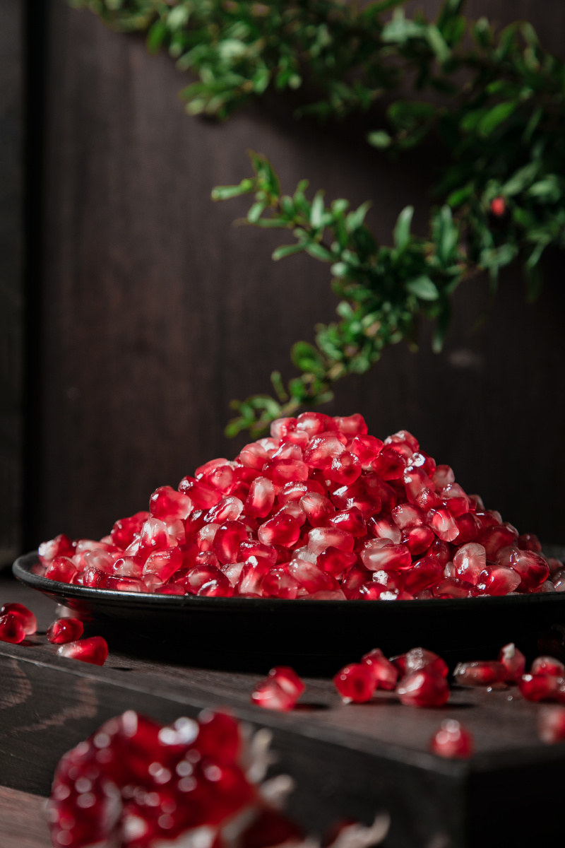 红色背景上的石榴籽.石榴片散落.垂直复制空间的文本.