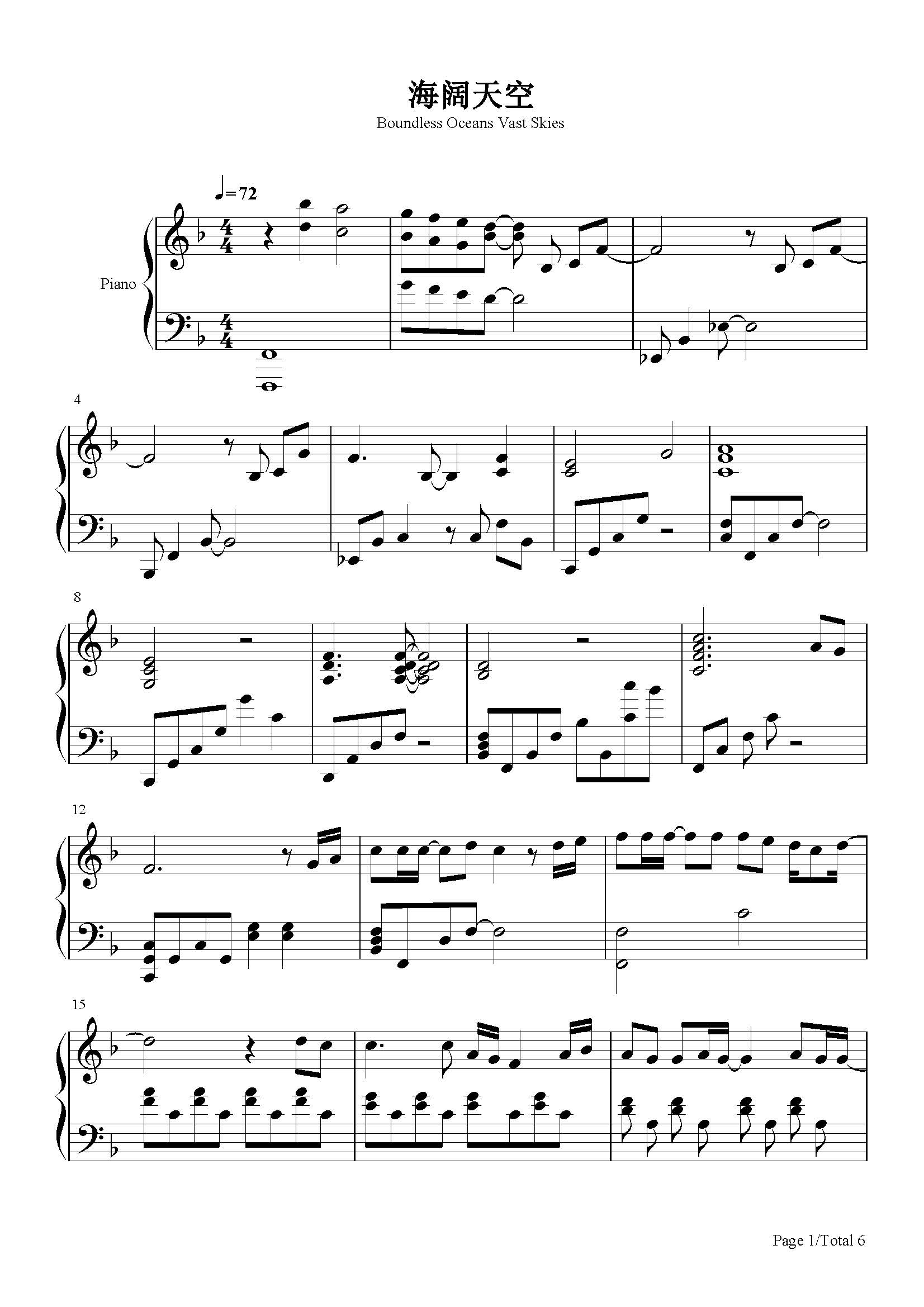 海阔天空钢琴谱beyondf调流行钢琴五线谱
