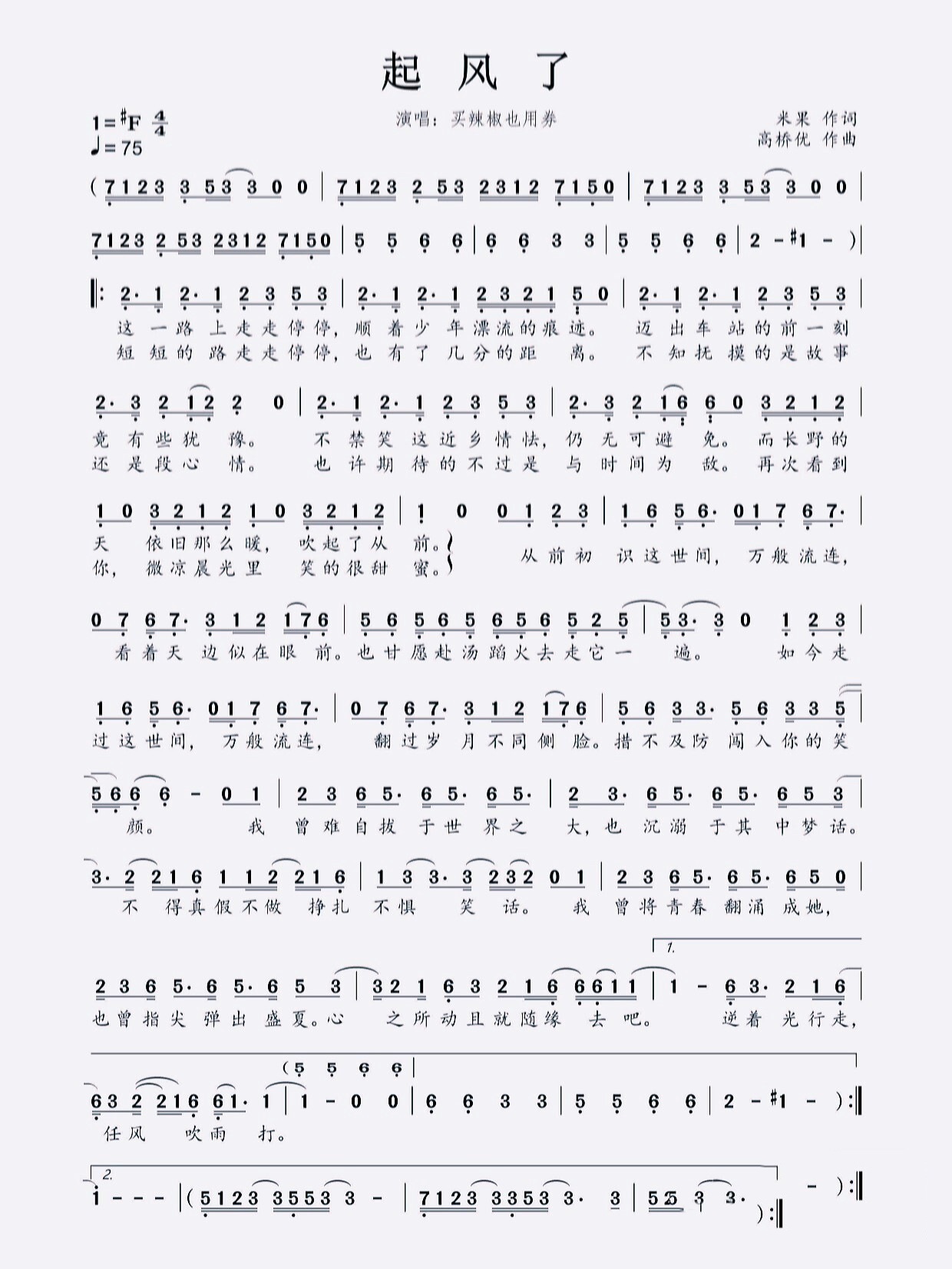 起风了简谱-买辣椒也用券演唱-孙世彦制谱1