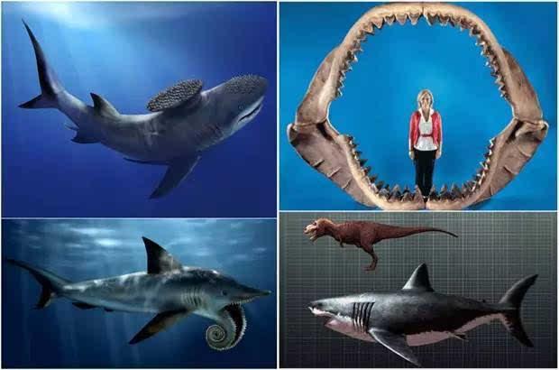 旋齿鲨(左下),巨齿鲨上下颌和人的比较(右上),巨齿鲨与霸王龙比较(右