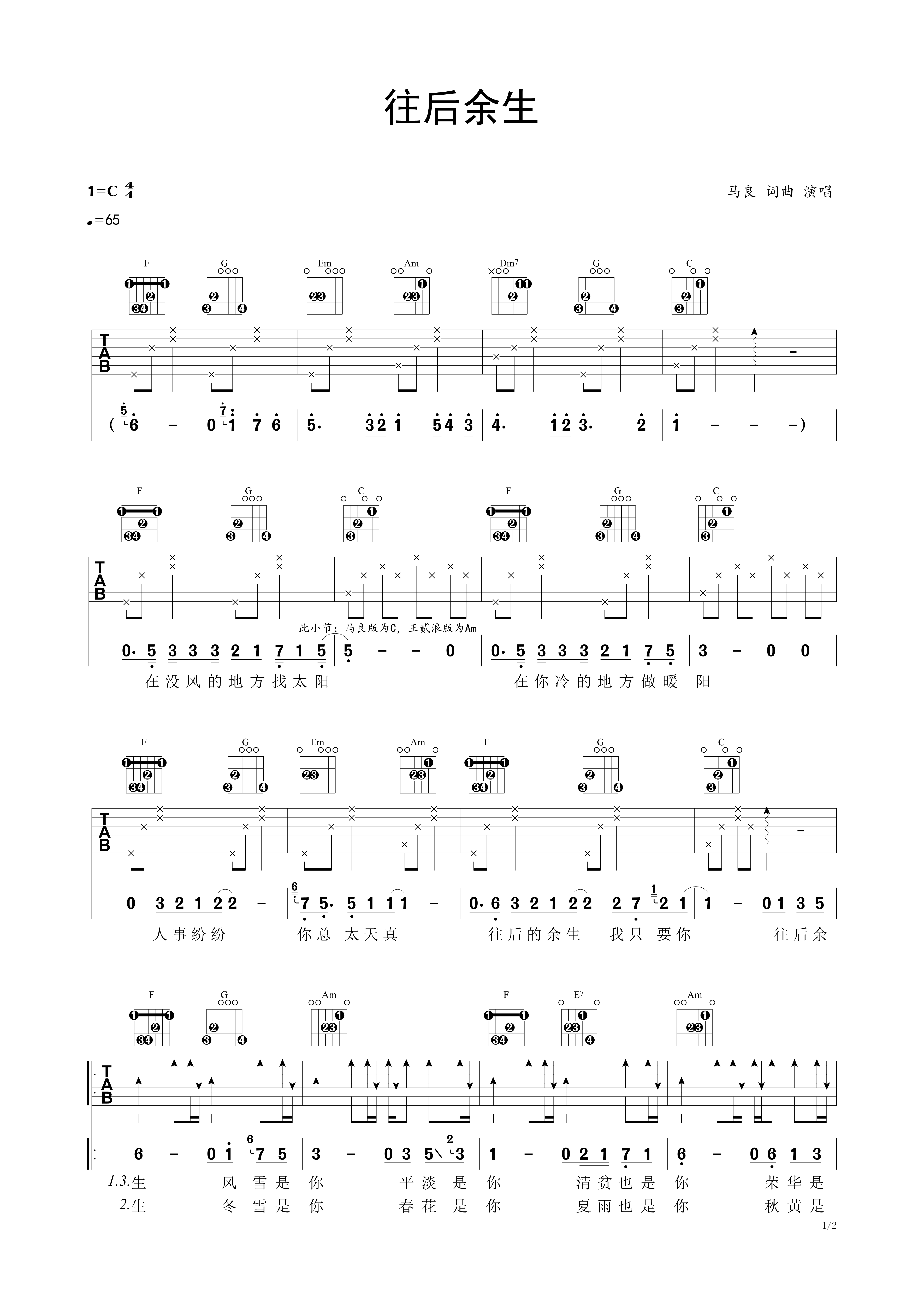 往后余生 c调 马良c调六线吉他谱-虫虫吉他谱免费下载