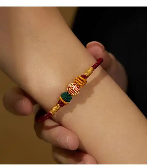 月斐珠宝古法黄金编织手链红绳福字福牌转运珠手绳足金虎年编绳女新款