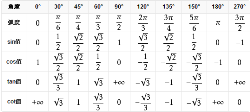 cos sin tan度数公式表