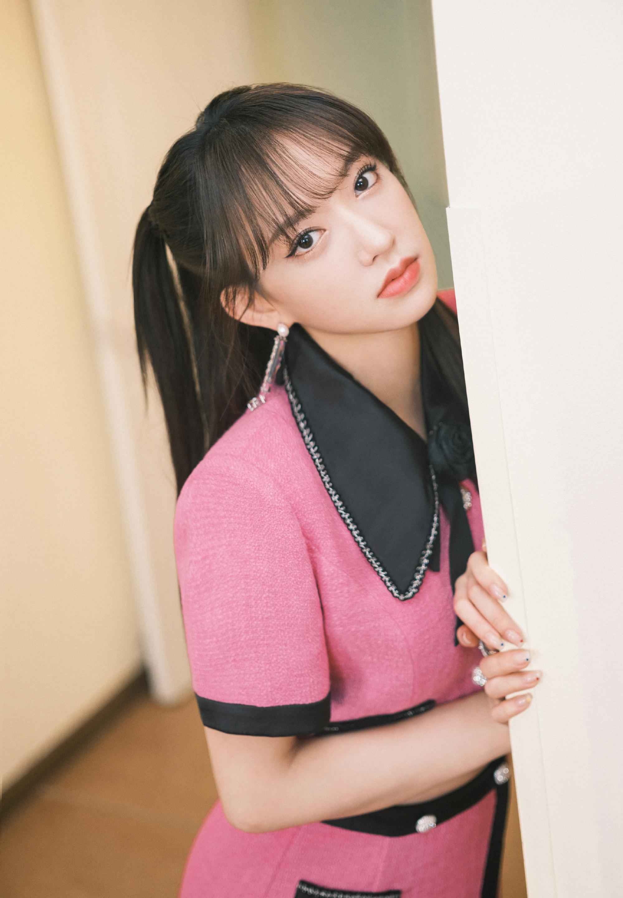 程潇小香风穿搭上线,高扎马尾粉色西装,又温柔又甜美_时尚_感觉_女孩