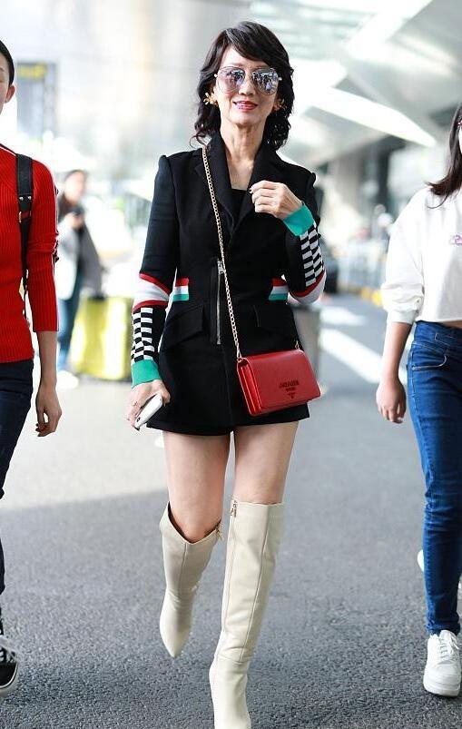 赵雅芝未修图爆光身穿格纹西装配短裤很显瘦松弛的皮肤太真实
