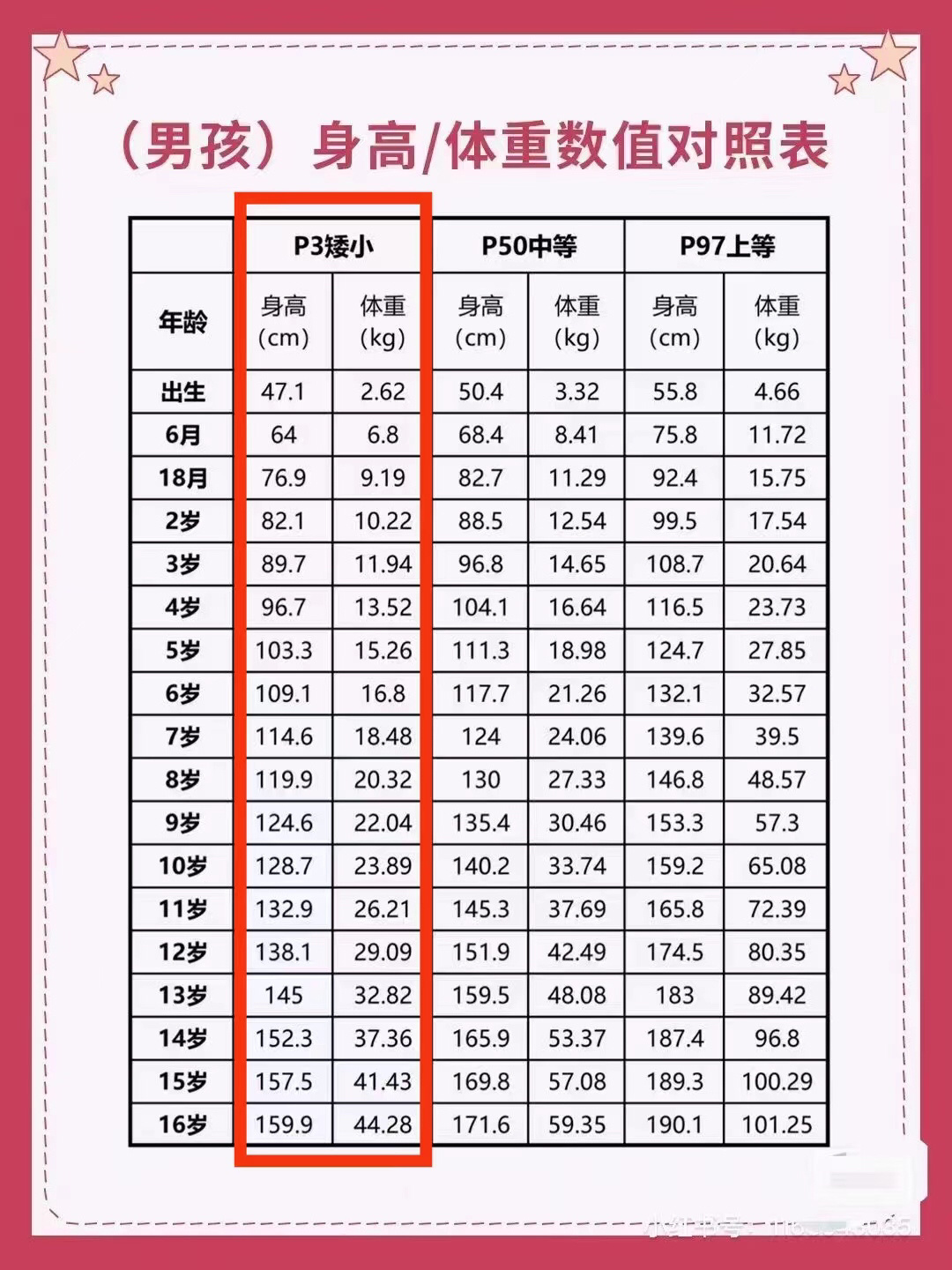 男孩身高/体重对照表 如图