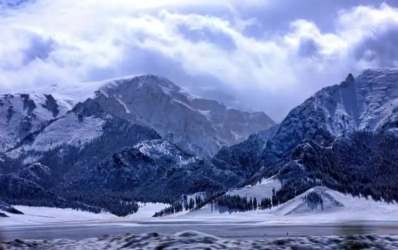 10月12曰新疆15人自驾游,10月3日新疆塞里木湖景区下雪,山上白雪茫茫