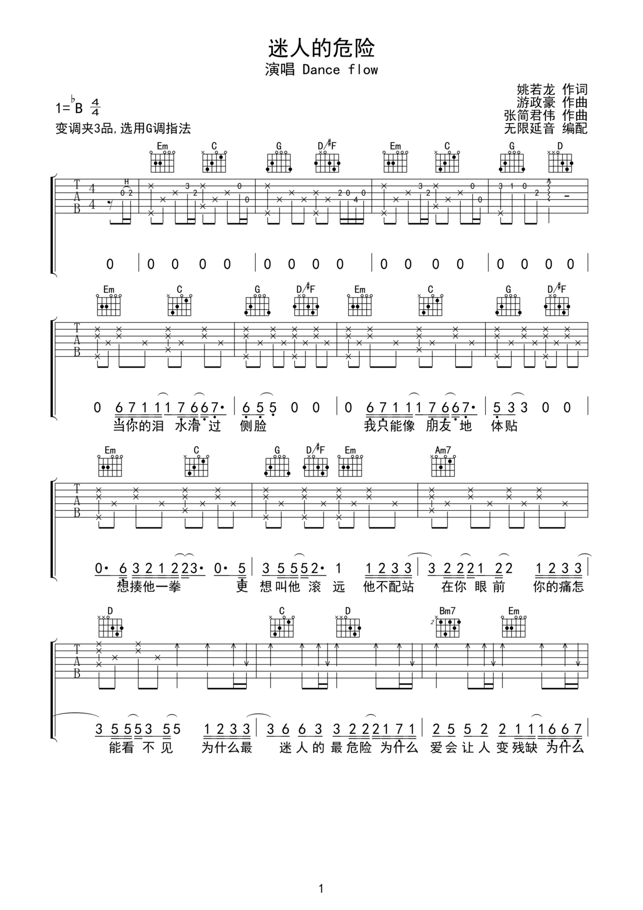 dance flow《迷人的危险》吉他谱 g调指法 弹唱谱