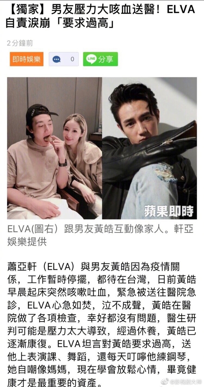 萧亚轩男友黄皓近日早上起床突然咳嗽吐血,被送往医院