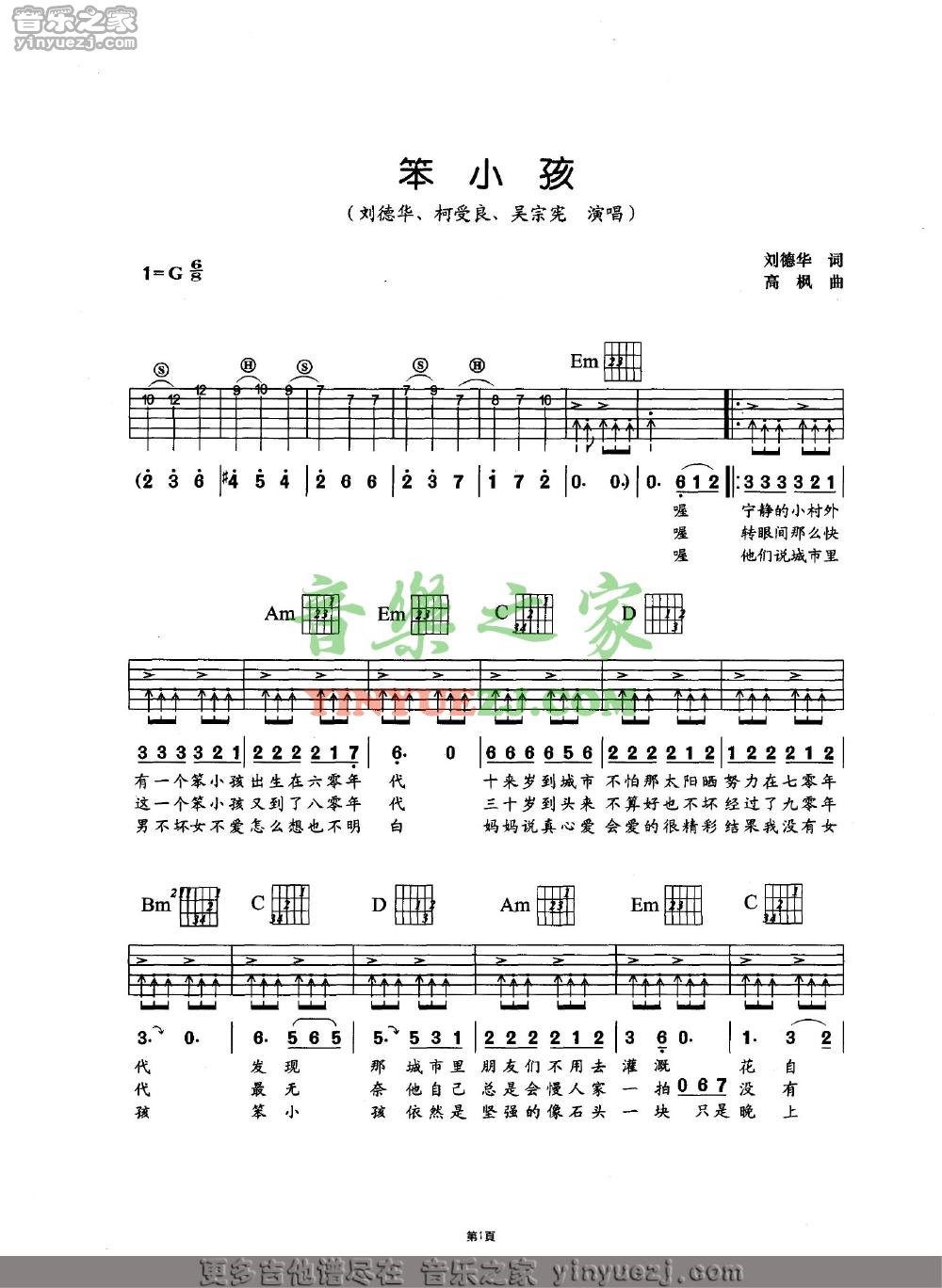 刘德华《笨小孩》吉他谱-g调原版六线谱