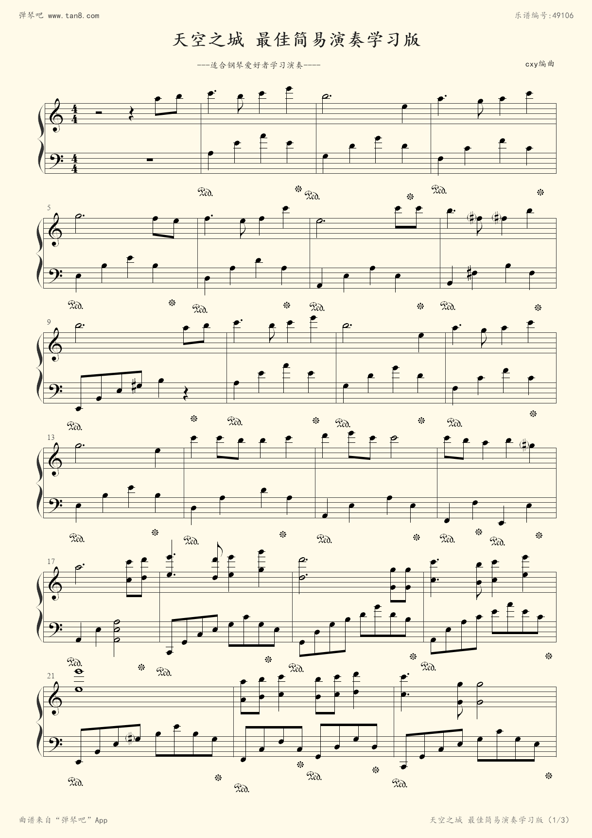 《天空之城,钢琴谱》c调版,(五线谱 钢琴曲 指法)-弹吧|蛐蛐钢琴网