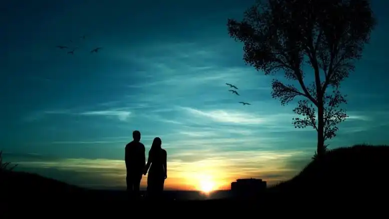 夕阳下情侣手拉手背影摄影图片