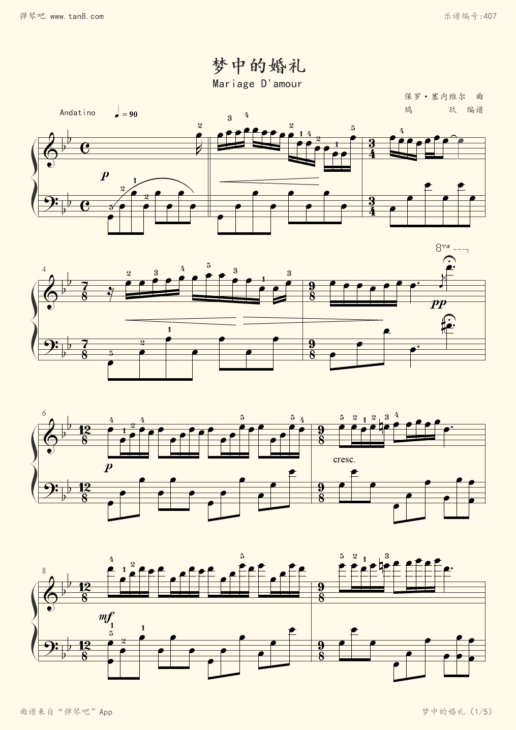 《梦中的婚礼》原调五线谱,带指法 - 抖音