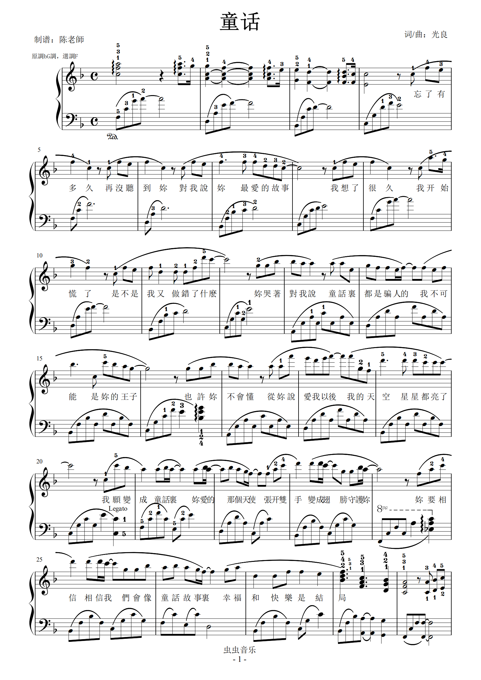 光良【童话】钢琴谱-c调-虫虫钢琴