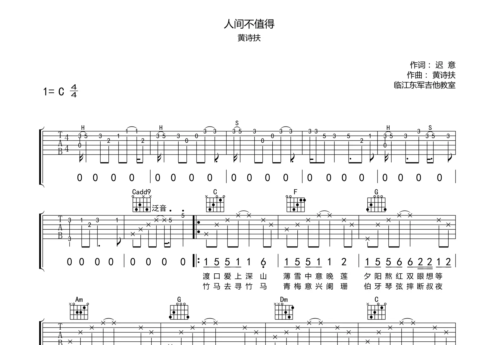 人间不值得吉他谱 c调 黄诗扶【附示范音频】2