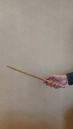 第三步:利用食指和中指错开的力量和鼓棒头部的重力让鼓棒旋转下去