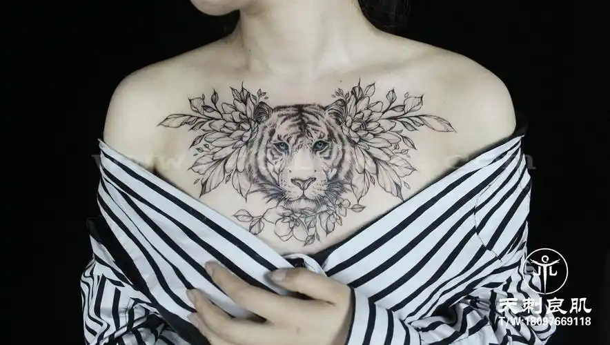 点刺花胸老虎素花纹身