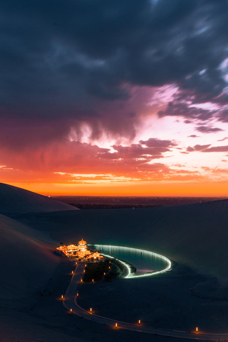 晚上…月牙泉华灯璀璨,美得令人流连忘返!