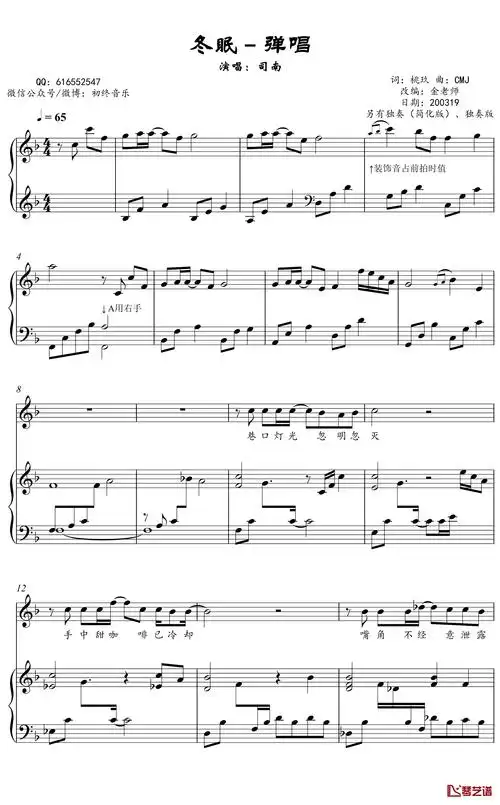 钢琴谱:冬眠【弹唱谱】司南「一撇撇耶」