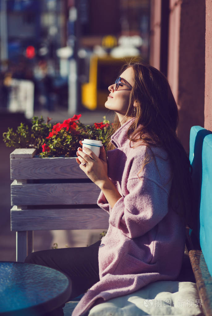 美丽的女人在露天咖啡馆喝咖啡