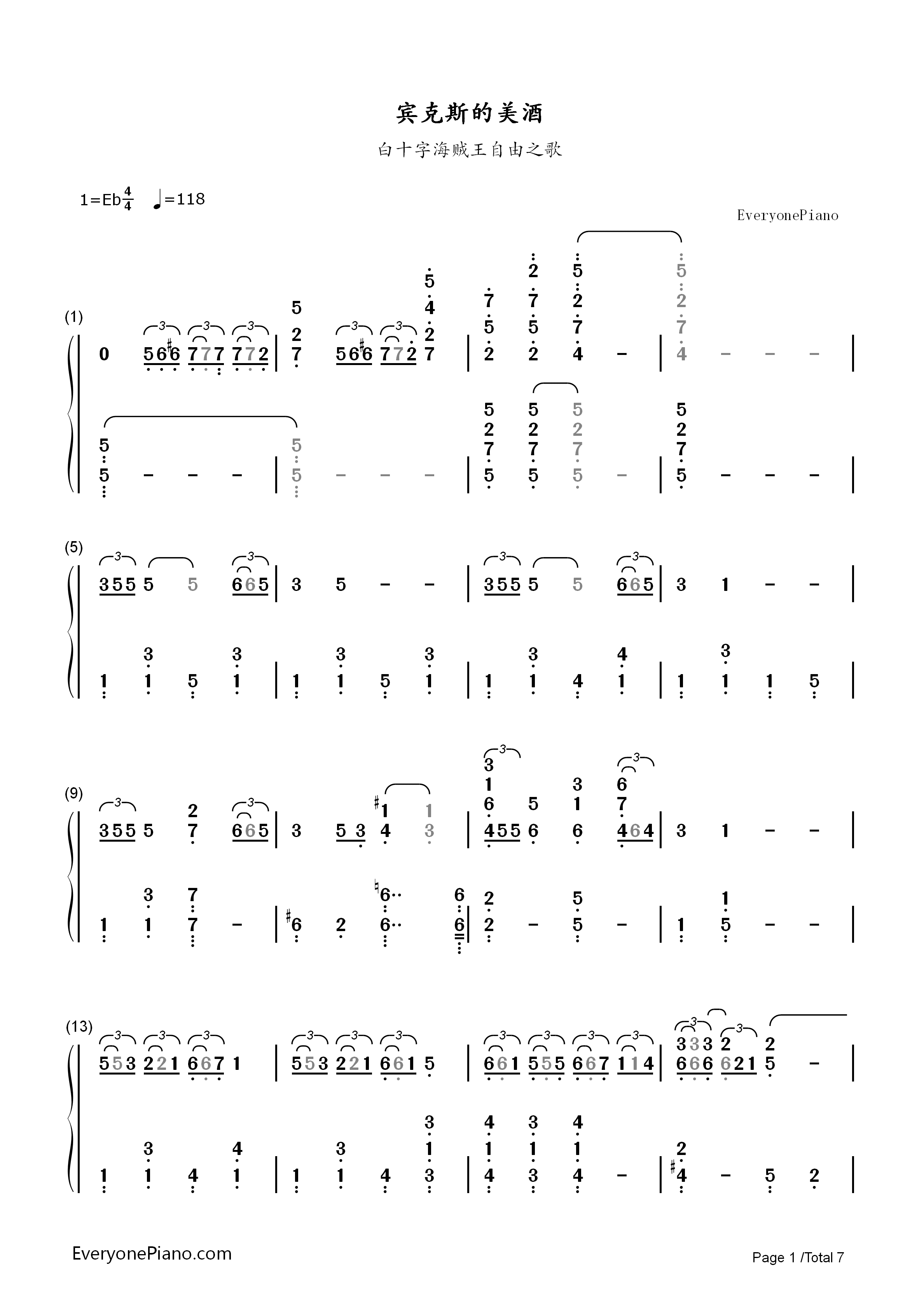 宾克斯的美酒白十字海贼王自由之歌双手简谱预览1