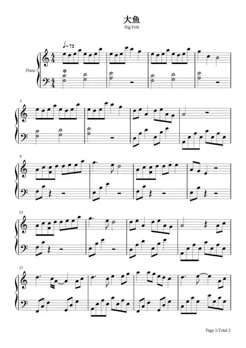 大鱼-c调简单版-周深-c调 -流行钢琴五线谱
