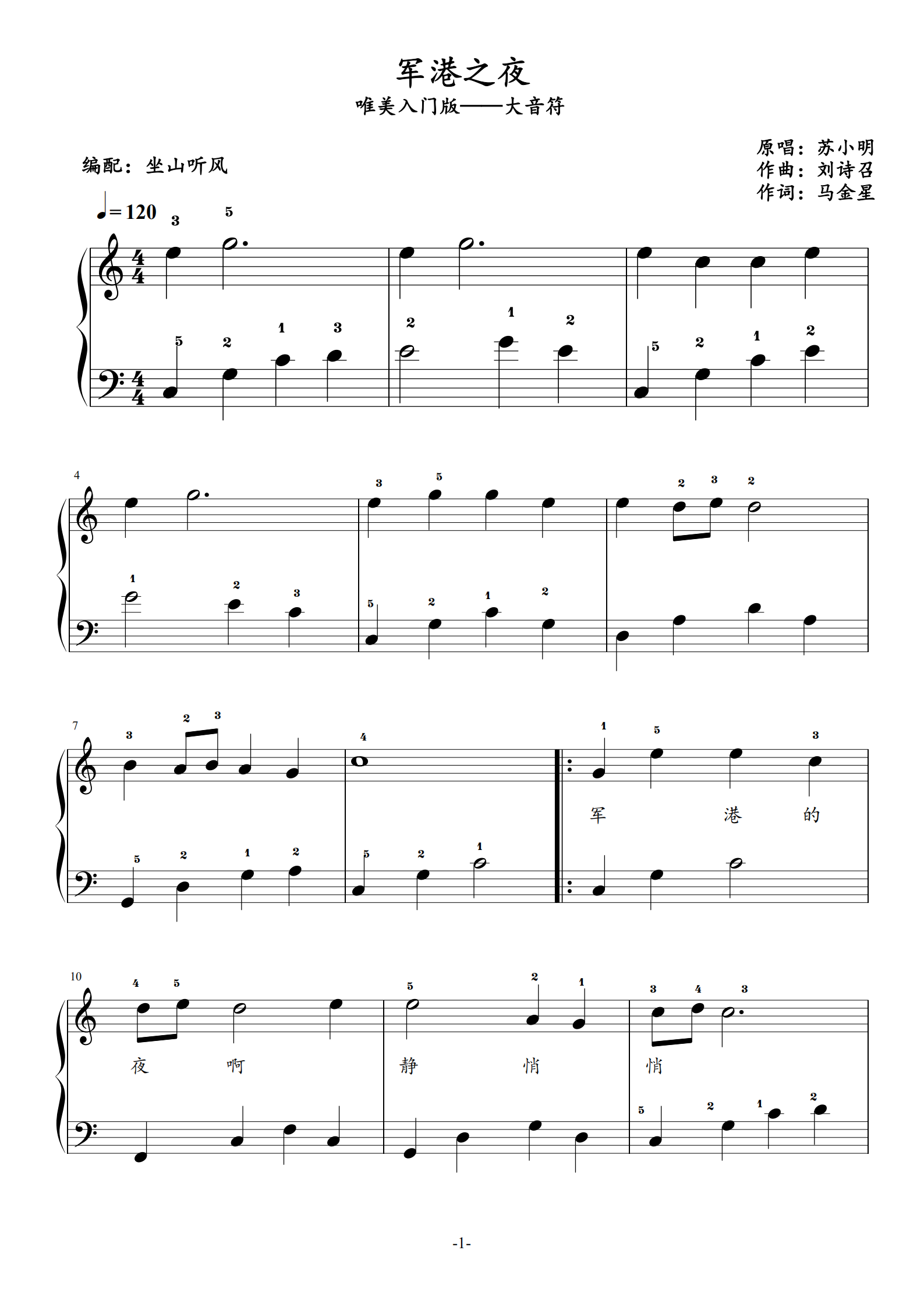 军港之夜-苏小明五线谱预览1-钢琴谱文件(五线谱,双手简谱,数字谱