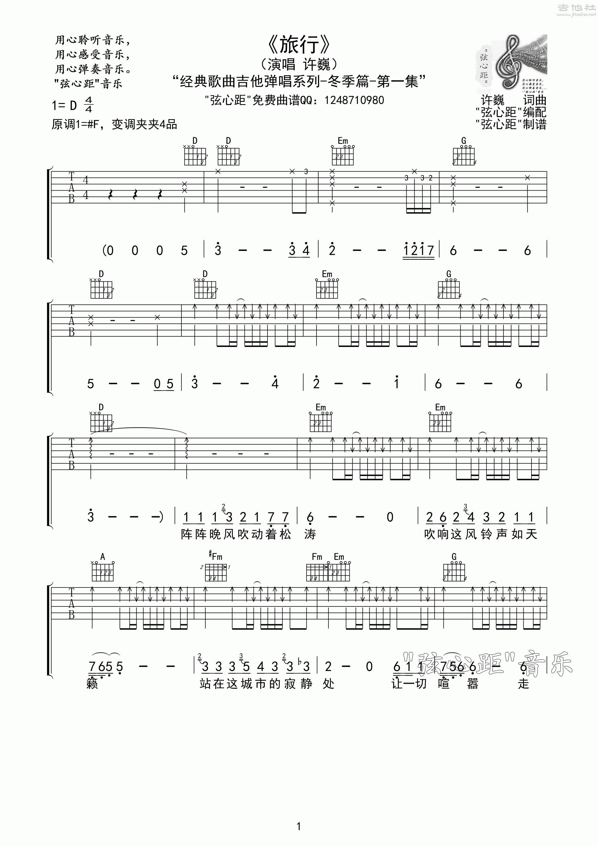 旅行 弦心距音乐 高清 许巍 吉他谱 和弦谱,简谱,五线谱