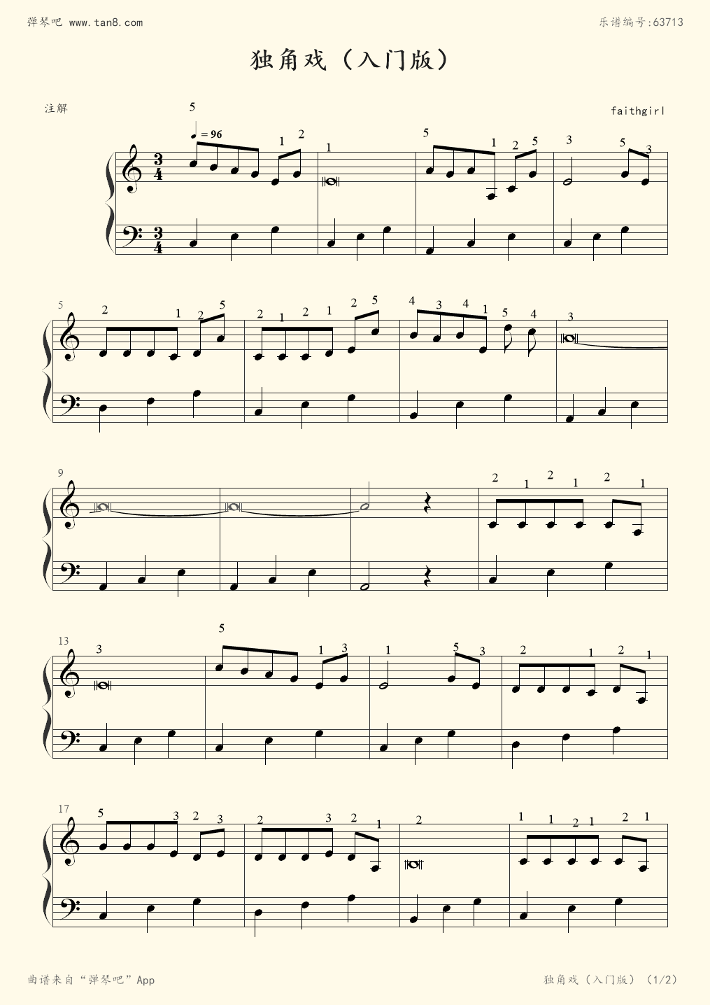 《独角戏 入门指法版,钢琴谱》许茹芸(五线谱 钢琴曲 指法)-弹吧|蛐蛐