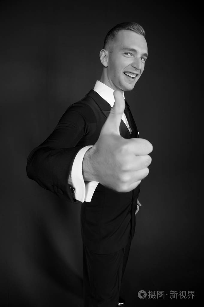 人用手势微笑.快乐的舞厅舞者穿着时髦的燕尾服.