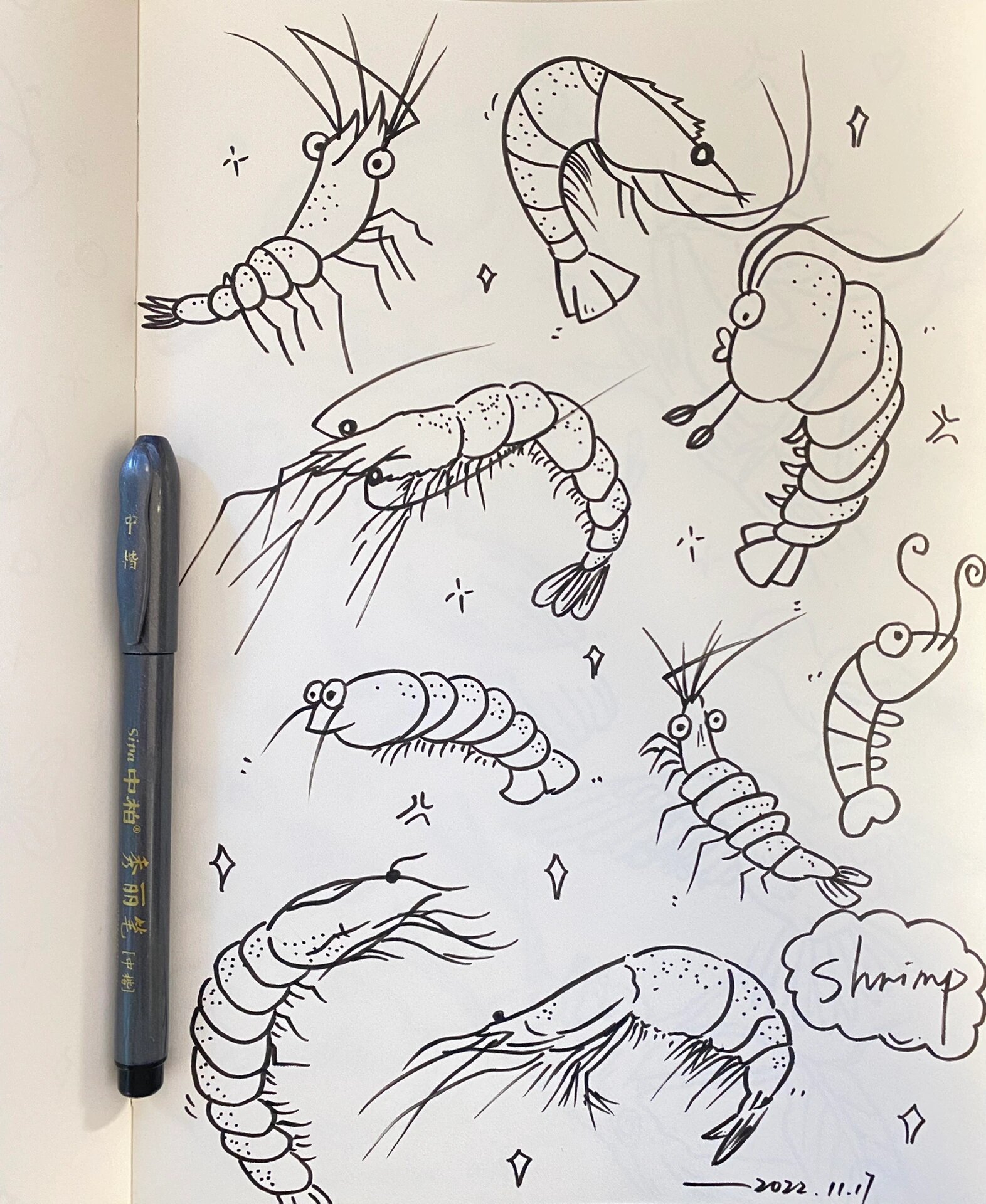 第73/100天打卡,简笔画临摹一组虾 虾(shrimp),是一种生活在水中的