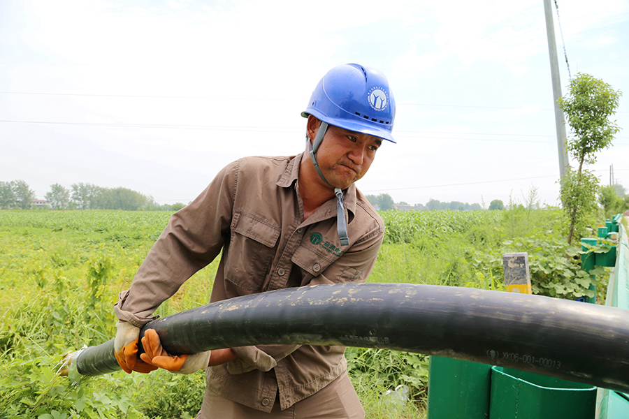 施工人员在高温下奋力敷设高压电缆.刘喆摄