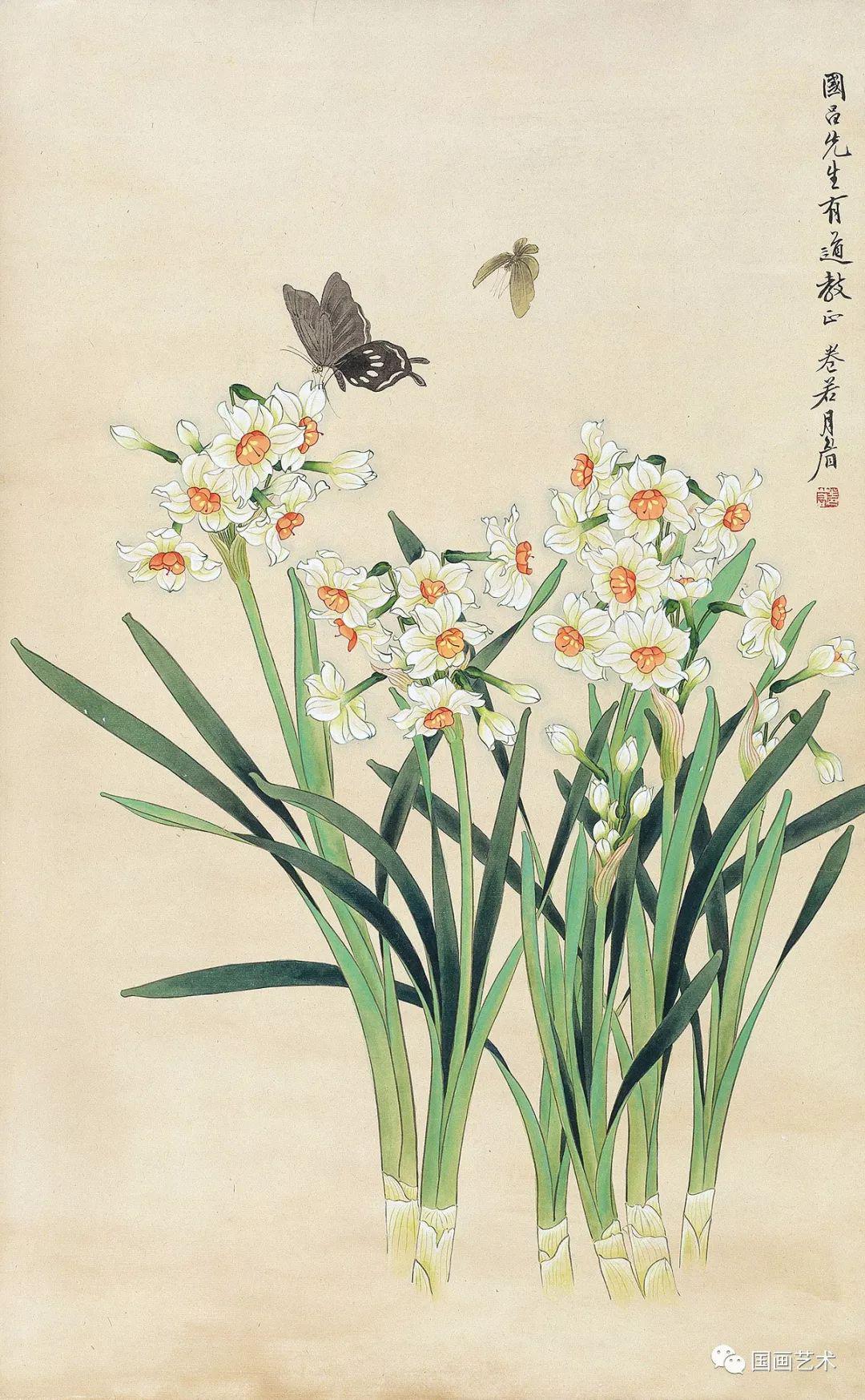 善花鸟,早年由恽南田,陈老莲花鸟入手,后上宗宋元工笔画法,所