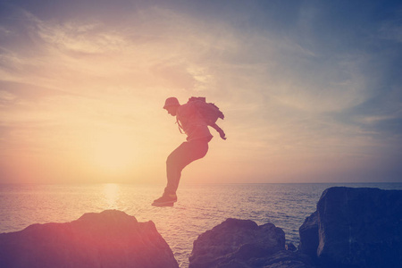 夕阳奔跑带着背包的勇敢的人在夕阳下的海洋附近的岩石上奔跑照片