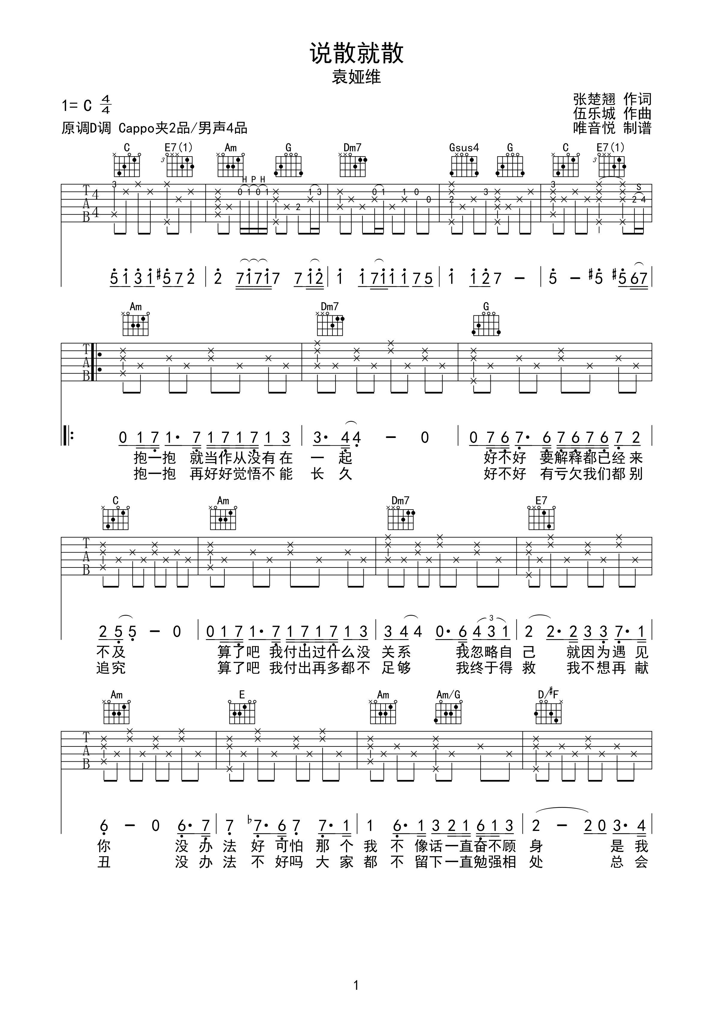 袁娅维《说散就散》吉他谱c调六线吉他谱-虫虫吉他谱免费下载