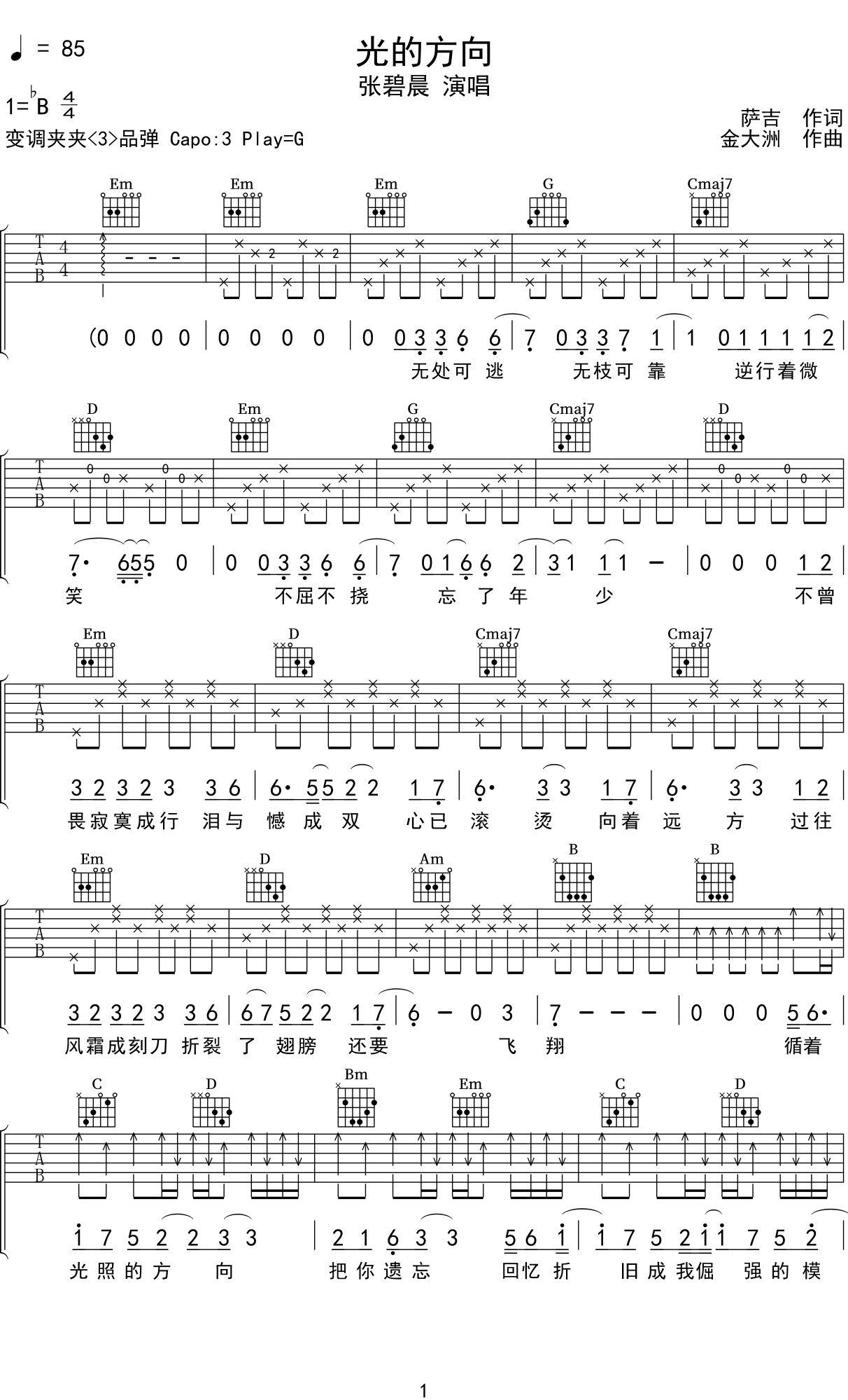 张碧晨光的方向吉他谱g调吉他弹唱谱