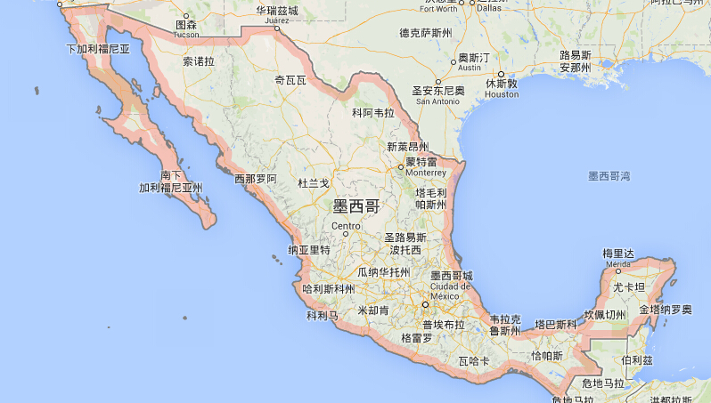 墨西哥,北部同美国接壤,南侧和西侧滨临太平洋,东部则为墨西哥湾.