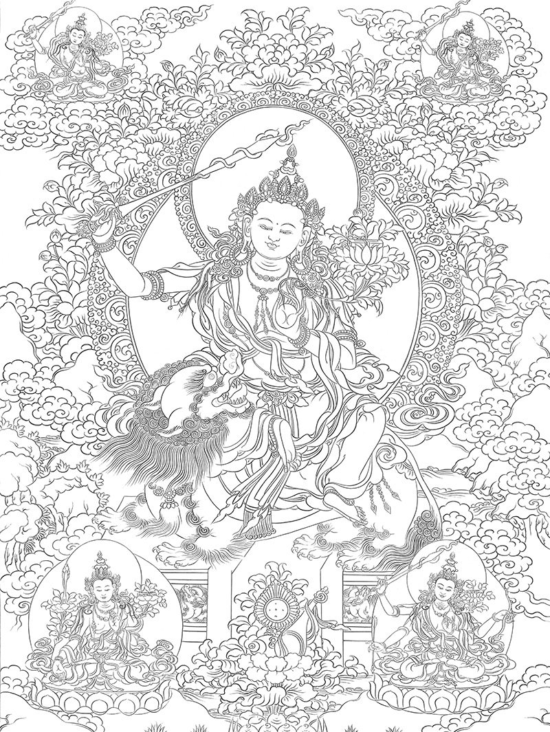 佛像唐卡描金五部文殊菩萨白描线稿画稿涂色diy
