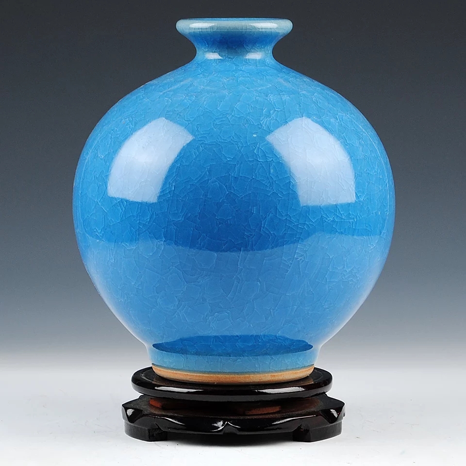 景德镇陶瓷器 蓝色仿古官窑冰片裂纹釉花瓶 现代客厅装饰品摆件
