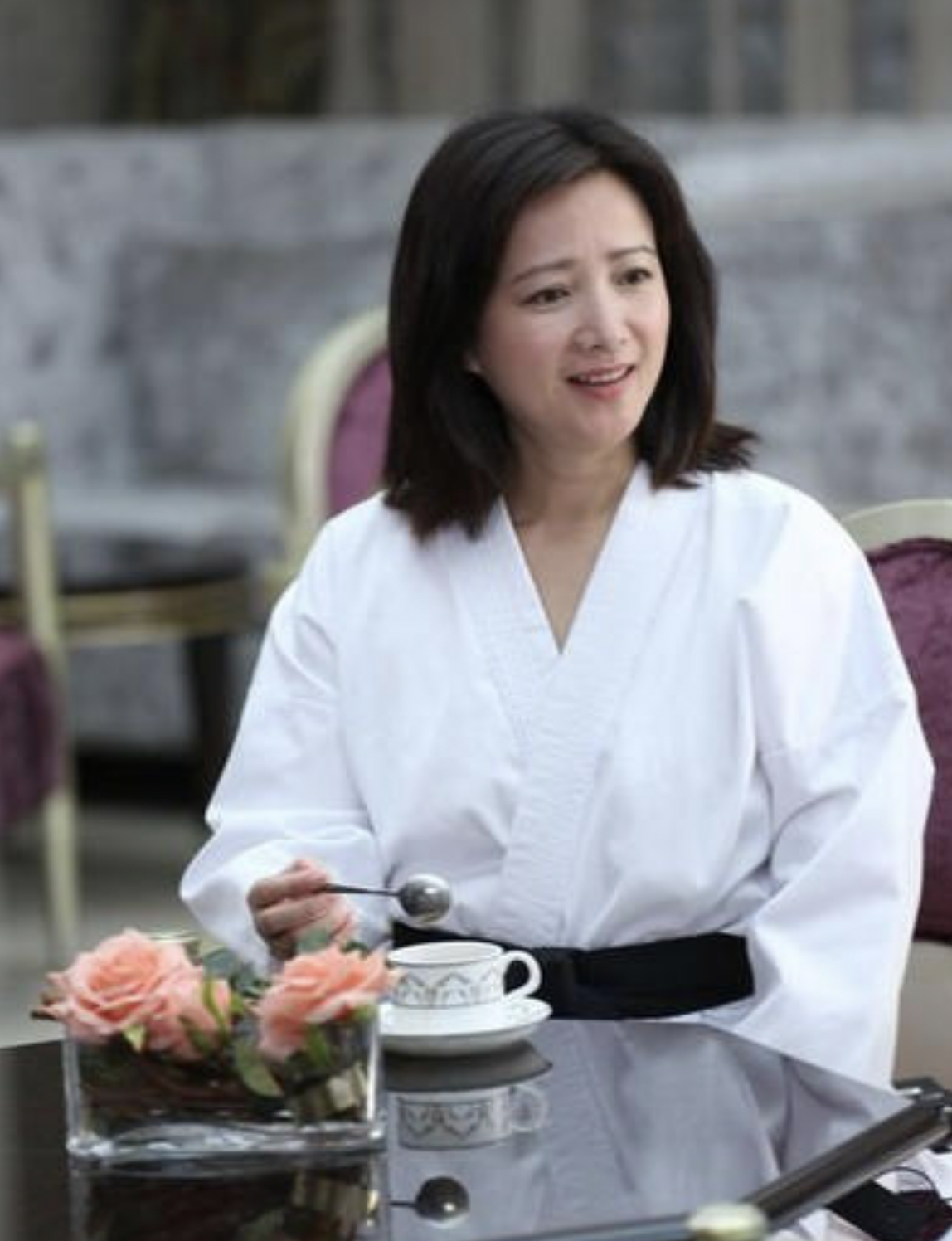 57岁何晴挺富态的梳贵妇头还有双下巴穿基础款气质也高级