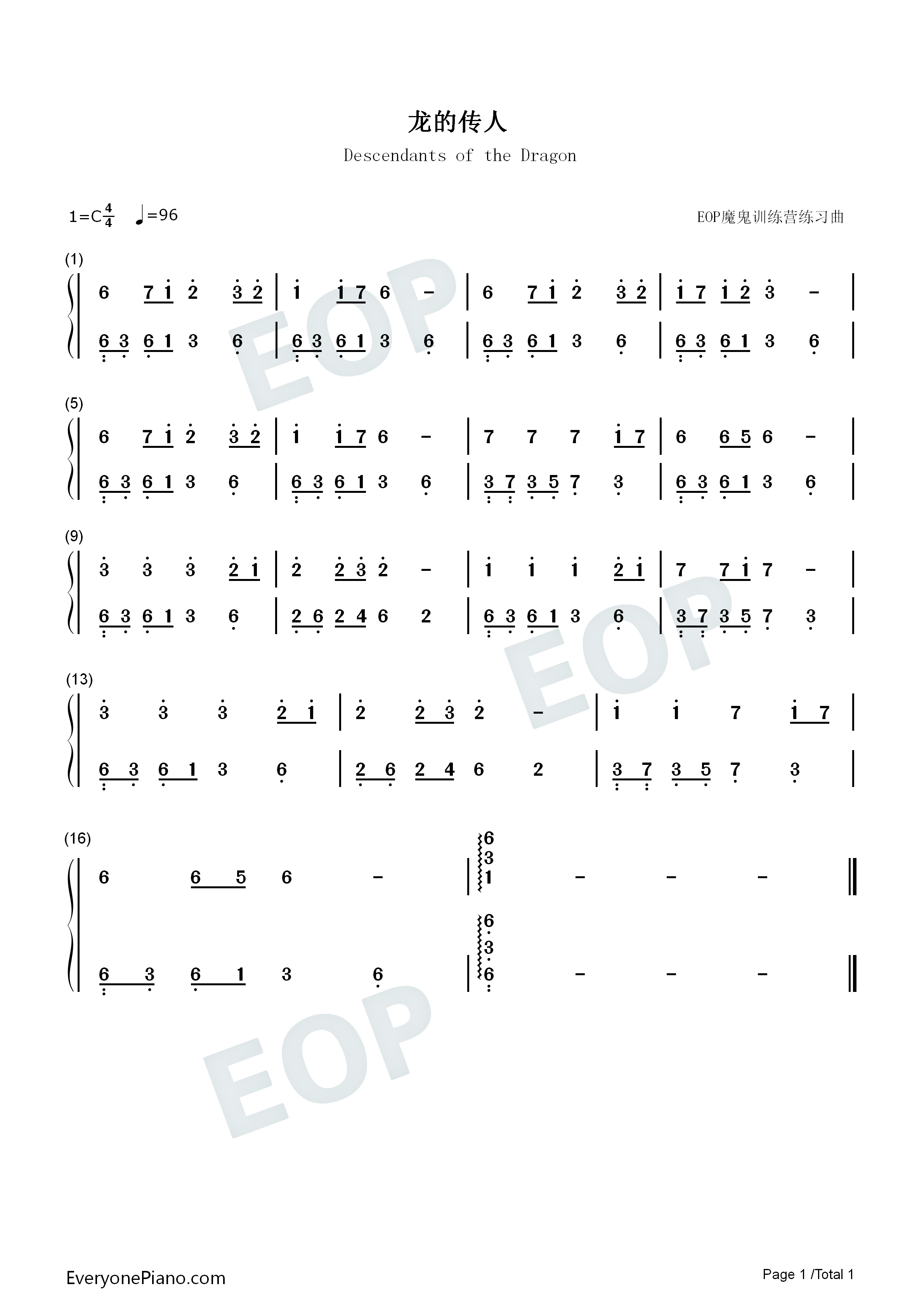 龙的传人,龙的传人钢琴谱,龙的传人c调钢琴谱,龙的传人钢琴谱大全