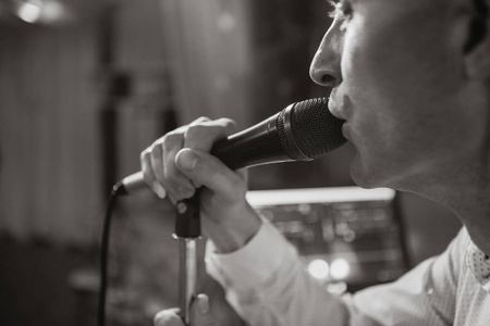 拿,拿着,休闲装,一个,衣服,话筒,站着,张嘴,休闲,休闲服,握着,唱歌