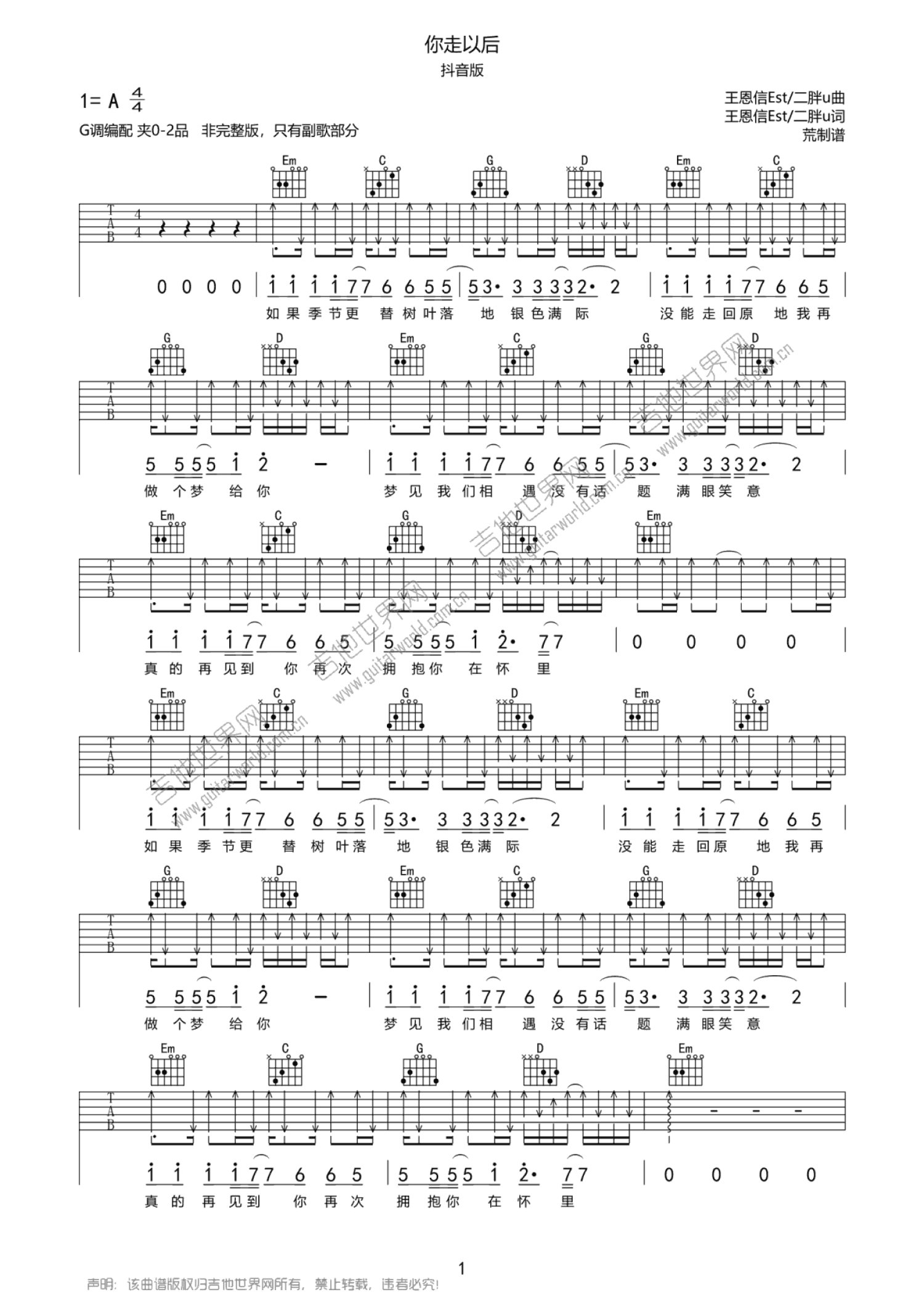 抖音版你走以后吉他谱g调吉他弹唱谱