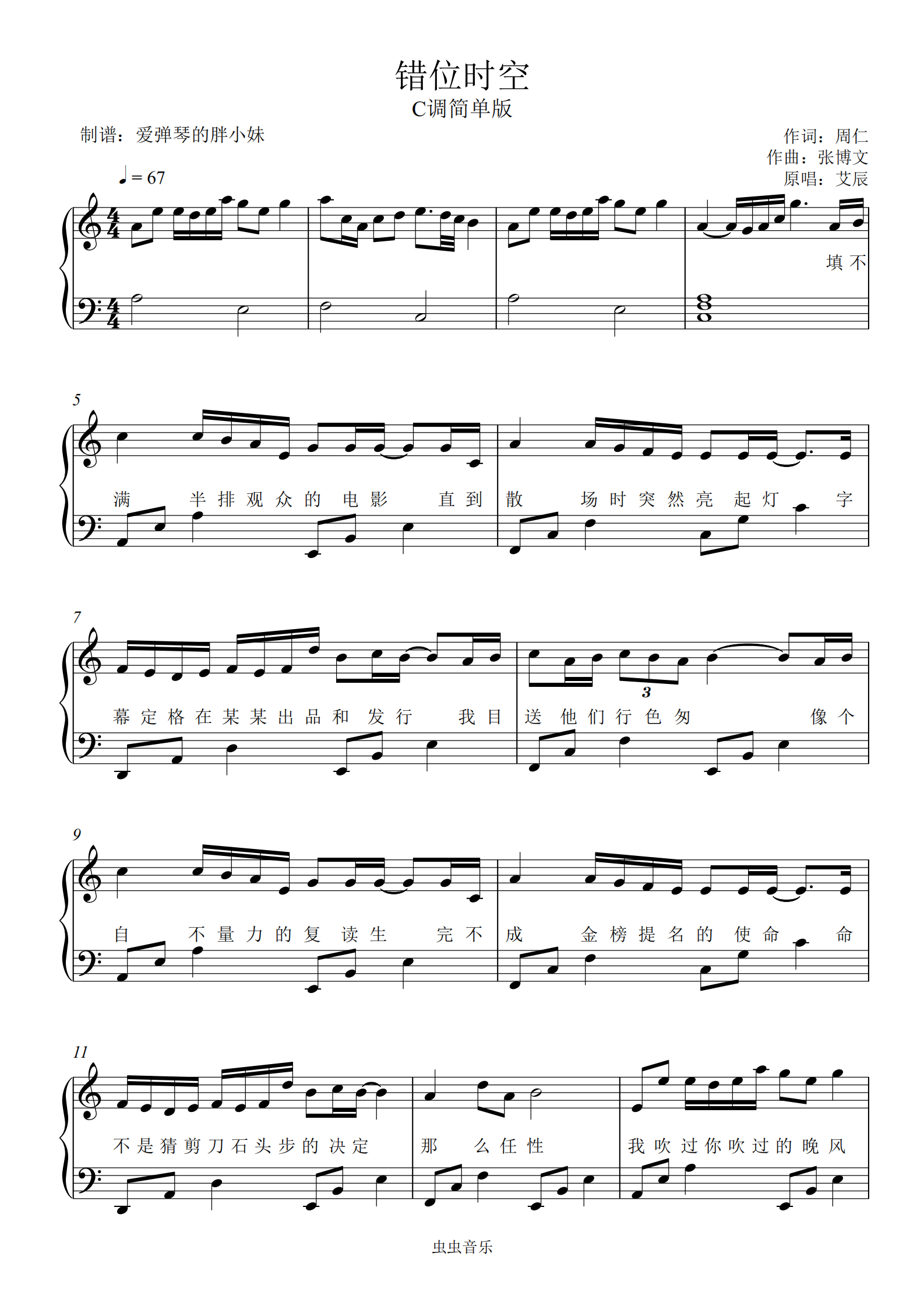 《错位时空》艾辰c调初学者简单版钢琴谱-虫虫钢琴