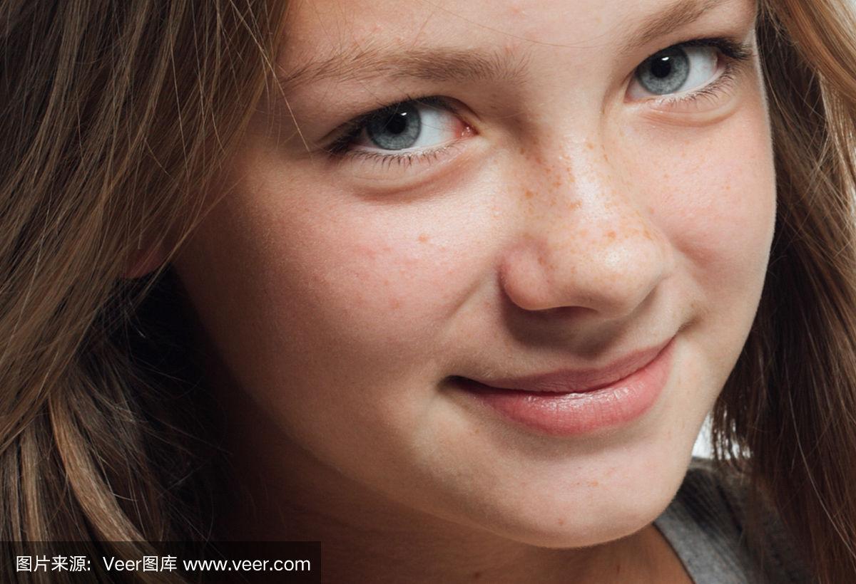 可爱的少女雀斑女人脸部特写肖像与健康的皮肤.