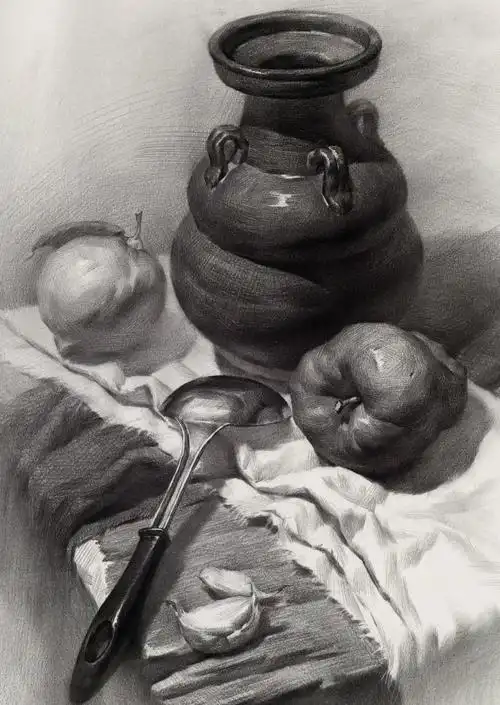 优秀组合素描静物:大勺子 罐子 蒜 黑白衬布 桌面