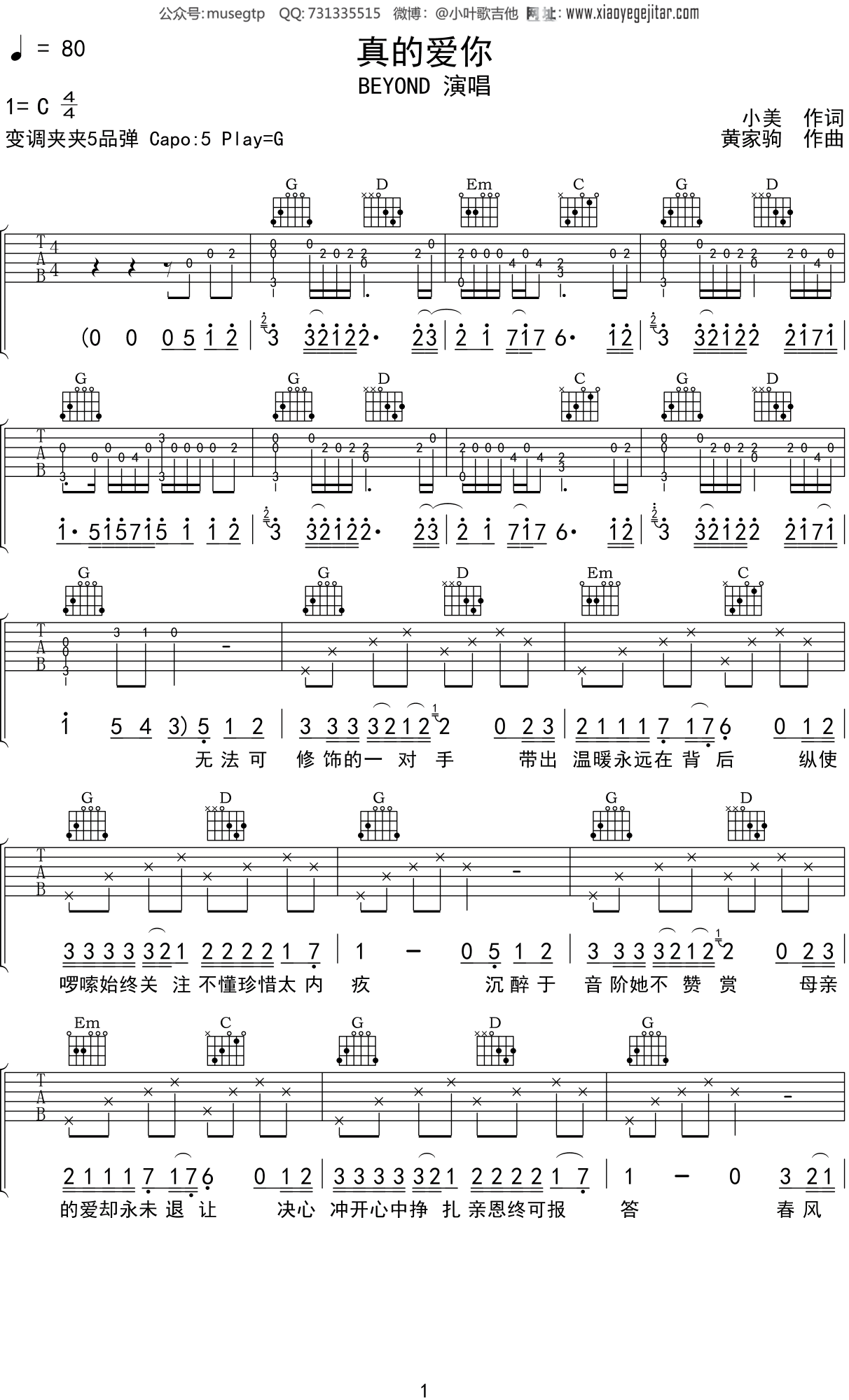 beyond《真的爱你》吉他谱_g调和弦指法_男生变调夹2-5品女生7品_酷音