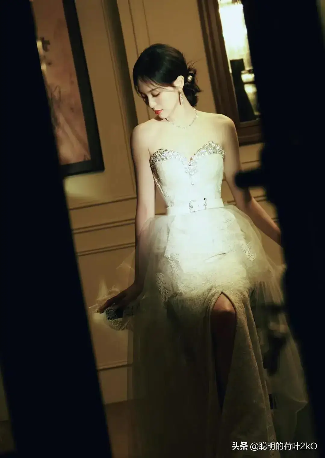 星光抹胸裙#@唐嫣今天发布一黑一白两组造型大片,白色宝石蕾丝抹胸裙
