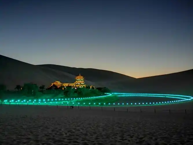 月牙泉夜景更美 夜幕降临,七彩灯光亮起,在周边高高沙山的环绕下,平添